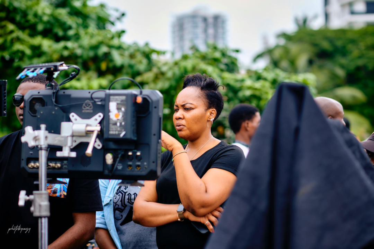 Nigerian director Sarah Kwaji and crew on the set of “Out in the Darkness” in Lagos on August 11, 2023. Sarah Stella Kwaji Productions/Handout via Thomson Reuters Foundation