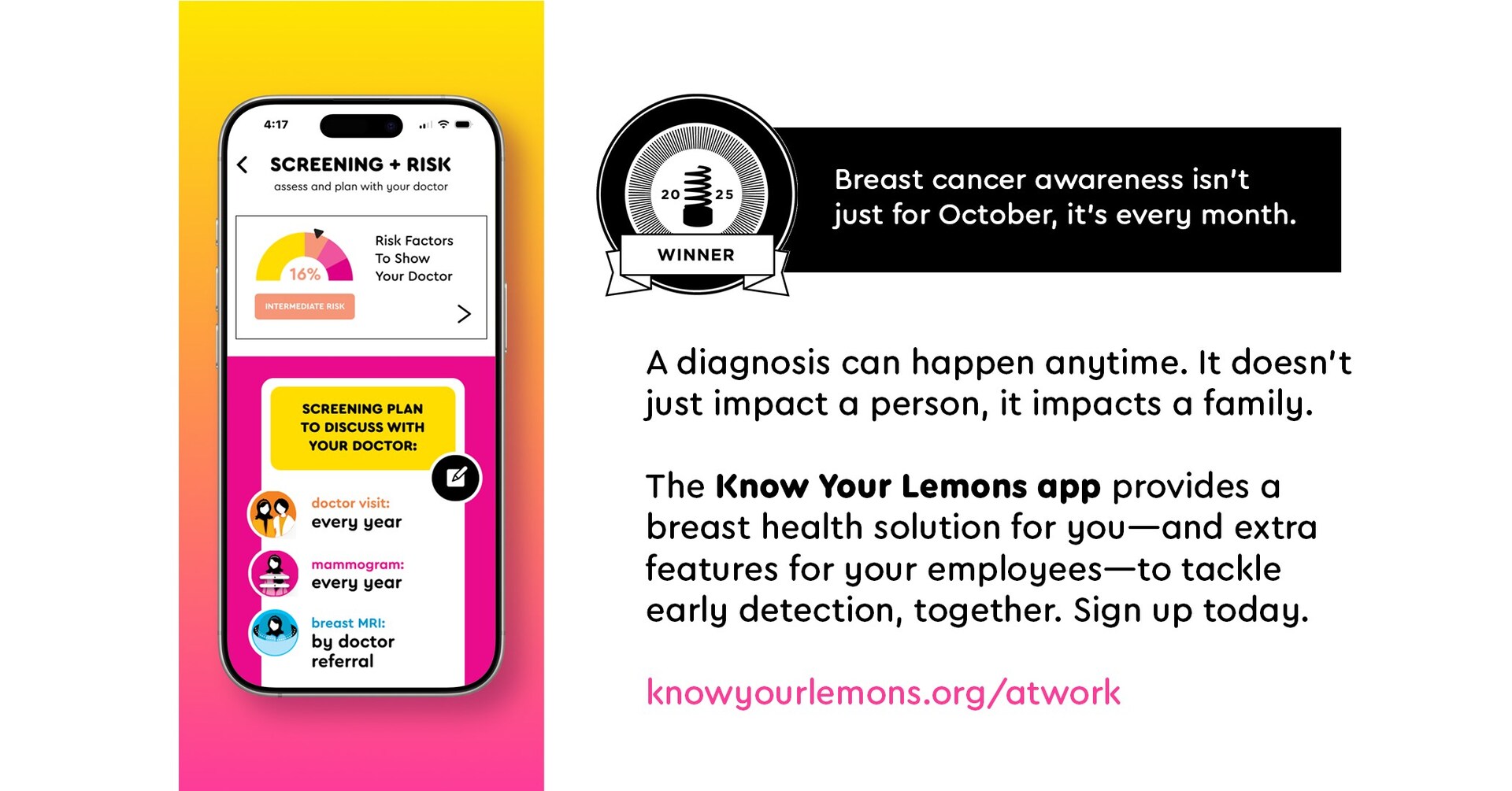 While headlines about celebrities like Beyoncé’s parents or Taylor Swift’s mom getting diagnosed with breast cancer bring attention to the cause, 85% of those diagnosed have no family history of it, with women being diagnosed at increasingly younger ages. The Foundation encourages everyone—regardless of gender or background—to download the Know Your Lemons app and create their “breast plan” by age 25. It may just be the most important app you, and your employees, ever use.